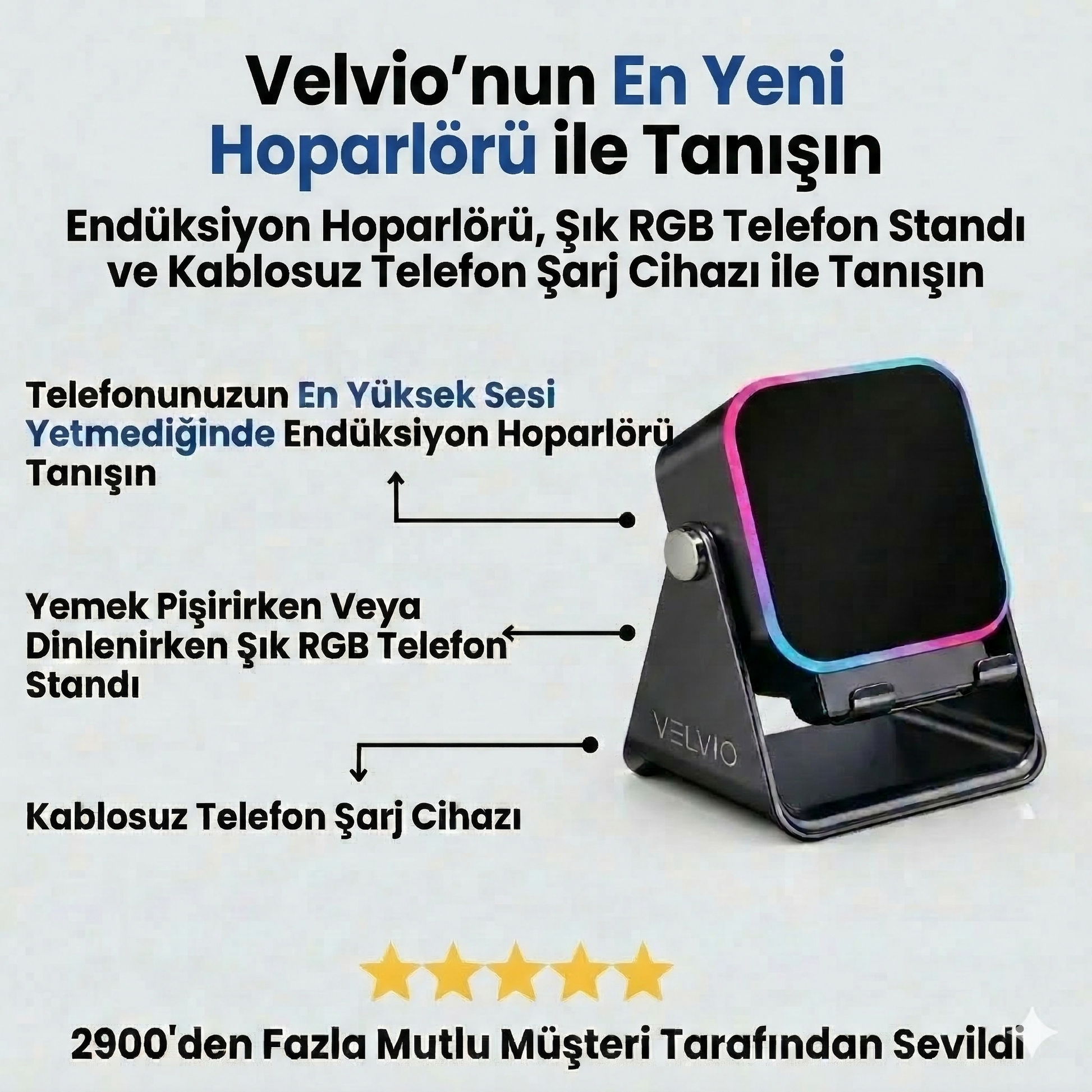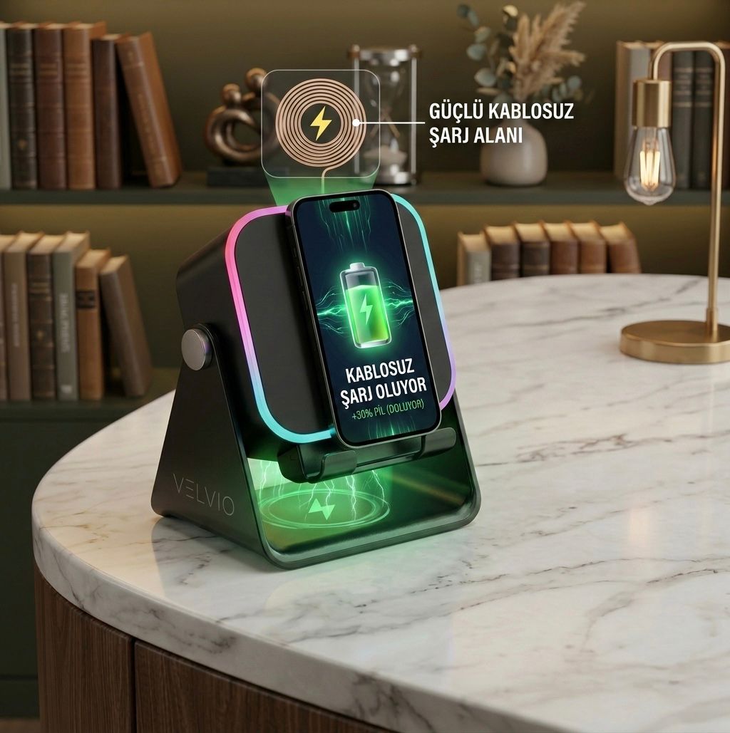 Velvio — indüksiyonlu şarj, 360° hoparlör ve LED atmosfer ışığını tek bir tasarımda birleştiren premium ses deneyimi.