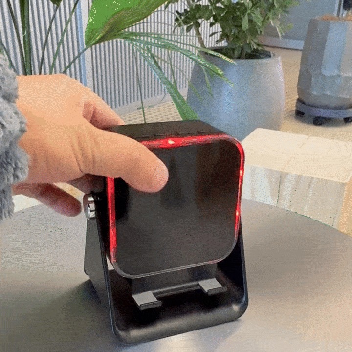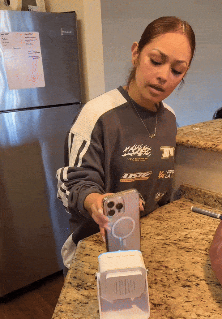 Qi destekli telefonunu üstüne bırak — kablo olmadan şarj başlar, müzik çalar, stand tutar.